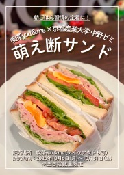 19期生が、若者の朝食離れと野菜不足を解決するために、見た目が鮮やかで、思わず 写真を撮りたくなる「萌え断サンド」を開発しました。喫茶you&me(京都市左京区) とのコラボです。ツナ&ハムサンドとポテサラサンドの2種類があります。テイク アウトもOK。販売は10月中を予定しています。 (2025/10) |