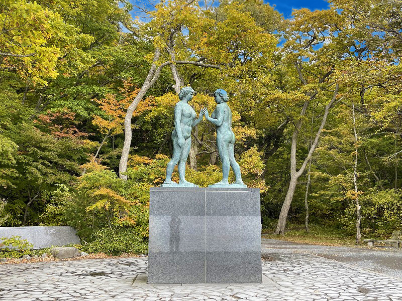 駅前広場に設置されたリンゴを持つ男女の銅像「りんごの風」。(2021.10)