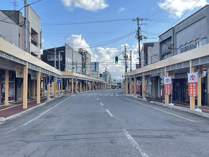 大曲駅前の「花火通り商店街」。雄物川河岸で毎年8月に開催される花火大会会場へのメイン通路。(2021.10)