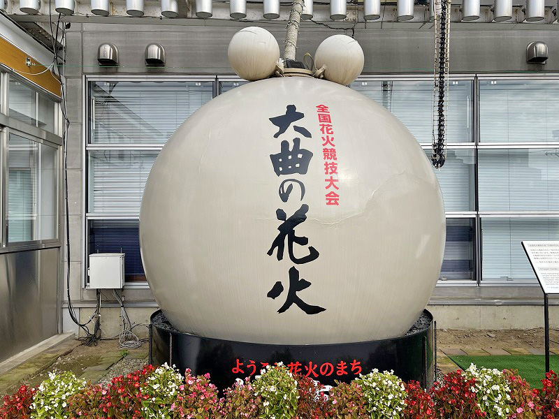 全国から選抜された一流の花火師が技を競う日本三大花火大会の1つに数えられる「大曲の花火」。駅前に設置された花火玉のモニュメント。(2021.10)