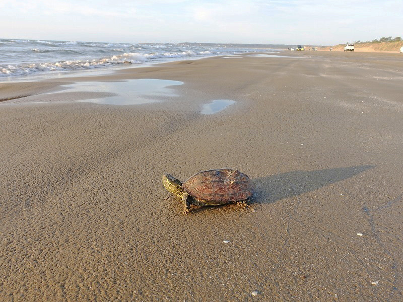 砂粒がきめ細かく海水を吸って硬くなることから車での走行が可能(2025.9)