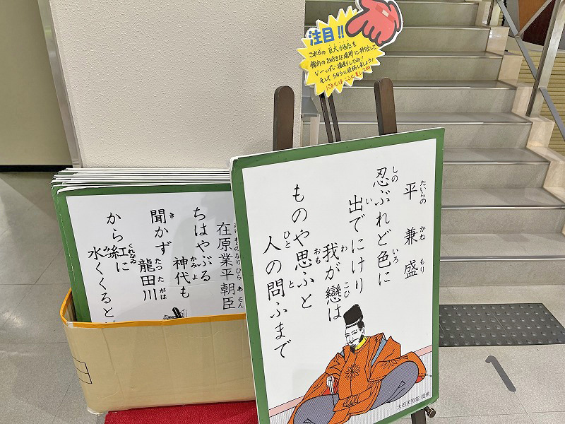 ロビーに再現されたかるた大会の会場。(2022.4)