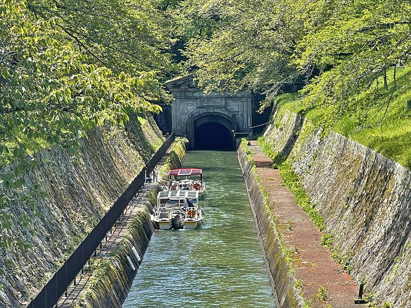 田辺朔郎ら日本人技師によって1890年に開通した「琵琶湖疎水」の「第1トンネル」。観光船「琵琶湖疎水船」が京都の蹴上との間を55分で結ぶ。(2022.4)