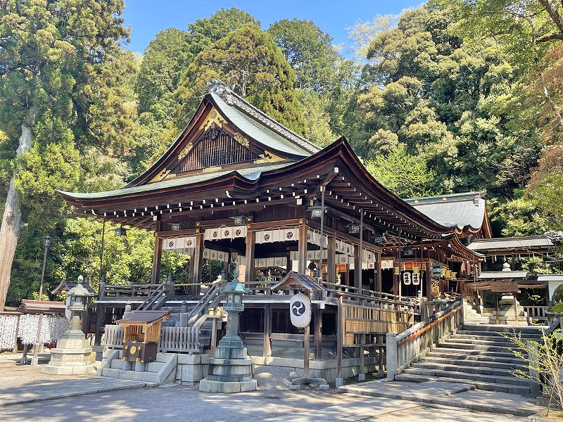 「お多賀さん」の名で親しまれる滋賀県第一の大社「多賀大社」。檜皮葺の「拝殿」(写真手前)と「本殿」(写真奥)。(2023.12)