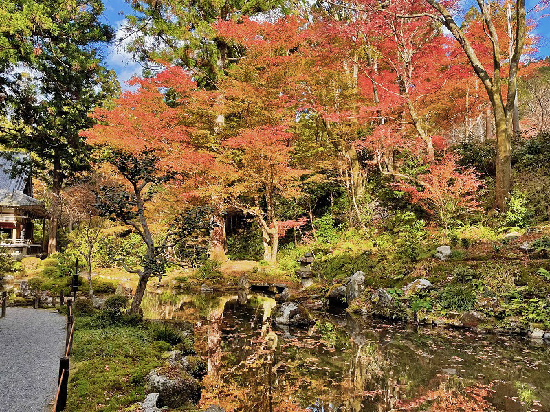 もみじが赤く映る「放生池(ほうじょうち)」を中心に東山を借景にした池泉回遊式庭園。(2021.11)