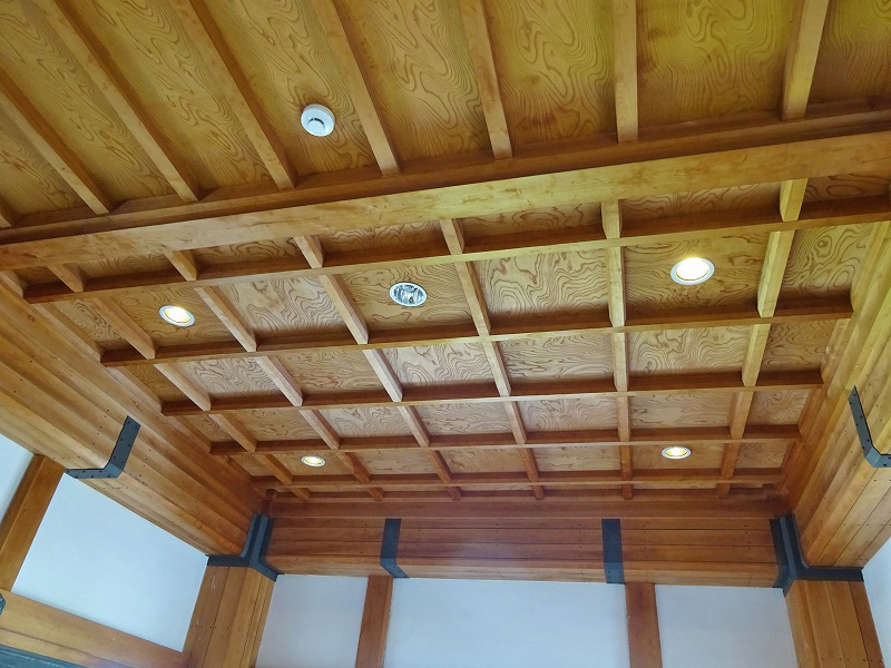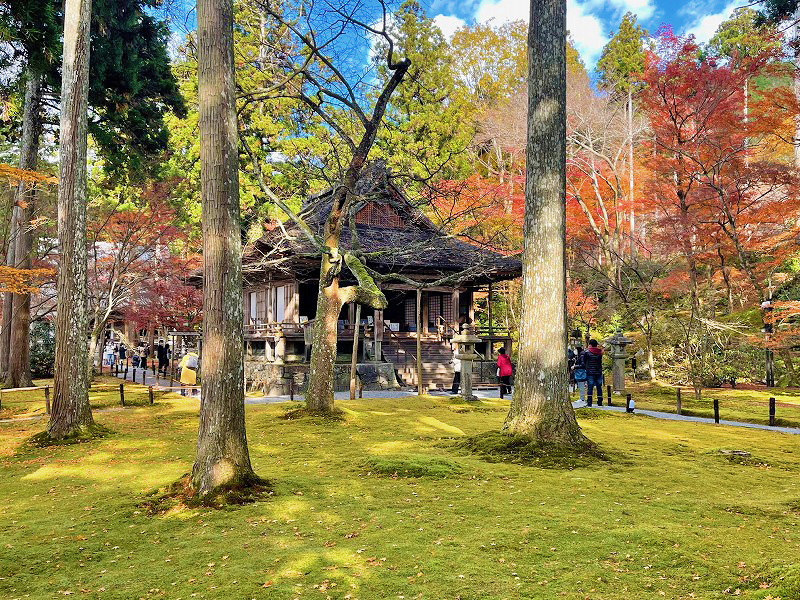「画仙堂」を覆うオレンジ色に輝くもみじ。(2021.11)