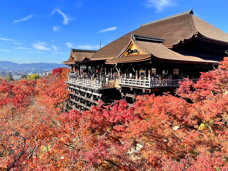 懸造りの木組みの上に建つ「清水寺」本堂(1633年築)。清水の舞台で知られる舞台の高さは13m。(2021.11)