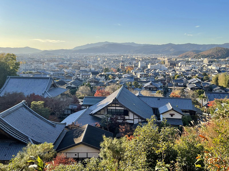 「清水の舞台」からの展望。写真右奥が高さ131mの京都タワー。(2021.11)