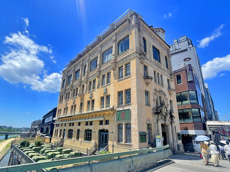 明治の煙草王村井吉兵衛によって建てられた八坂神社内の洋風建築「長楽館」(1909年築)。レストランや喫茶店のほか宿泊施設もある。(2017.4)