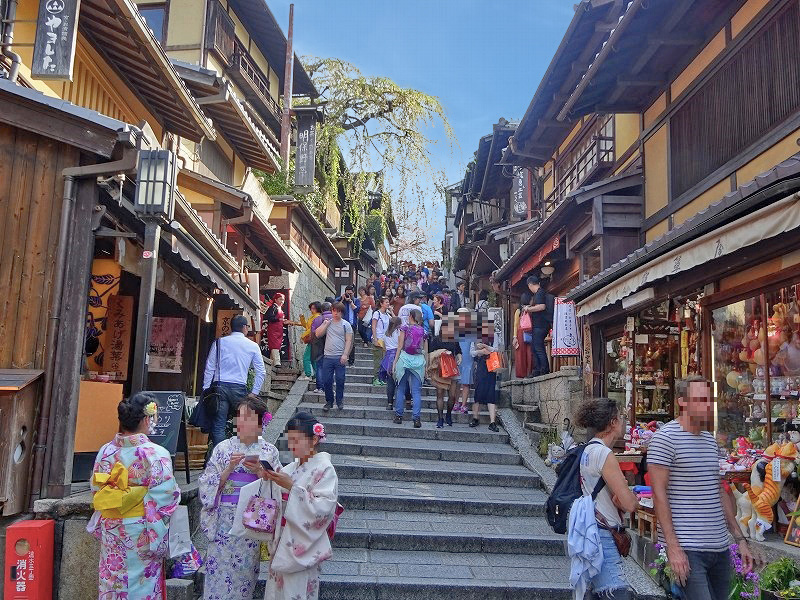 「二年坂」は「八坂通」を過ぎると「三年坂(産寧坂)」となる。(2017.4)