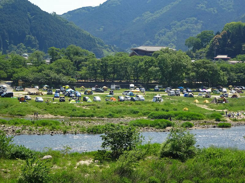 多くの観光客で賑わう笠置大橋たもとの「笠置キャンプ場」。300円で利用できる。(2017.5)