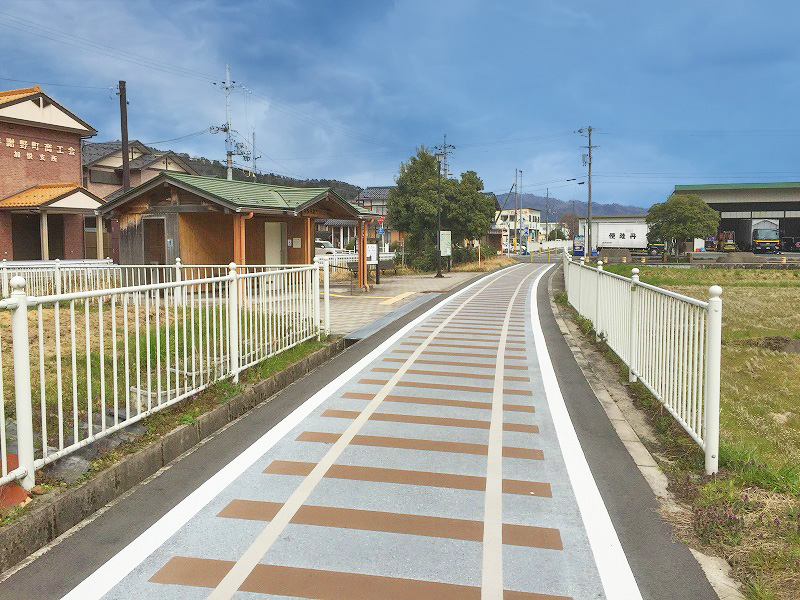 加悦鉄道の廃線跡地は「加悦岩滝自転車動線」としてサイクリングロードとして活用。路面に描かれたレールが往時を偲ばせる。(2015.3)