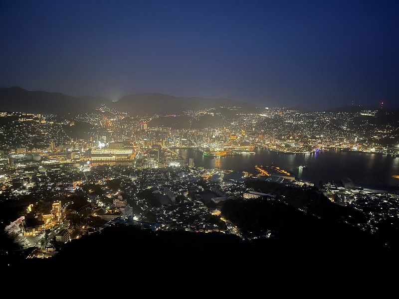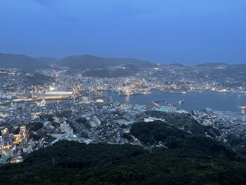 「稲佐山山頂展望台」から見晴らす日没15分前の長崎市街地。天然の良港と称される理由が一目瞭然。(2023.3)