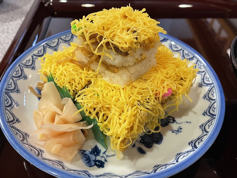 手延べで作られる「島原そうめん」。「麺商須川・面喰い」の「ぶっかけ海かけ昆布そうめん」。のどごしが良くコクのある麺。(2023.3)