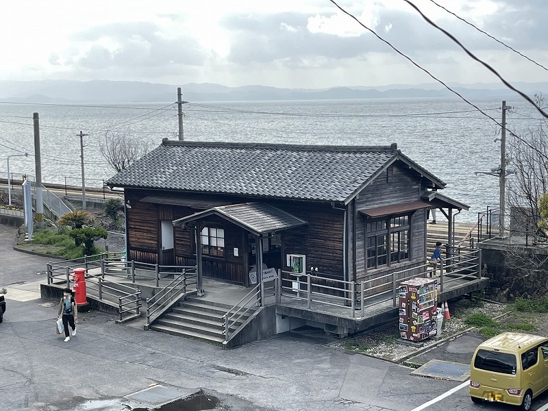 駅舎に入った瞬間に大村湾を望む。1993年竣工ながら開業当時の雰囲気を残すため敢えて木造駅舎として建てられた。(2023.3)
