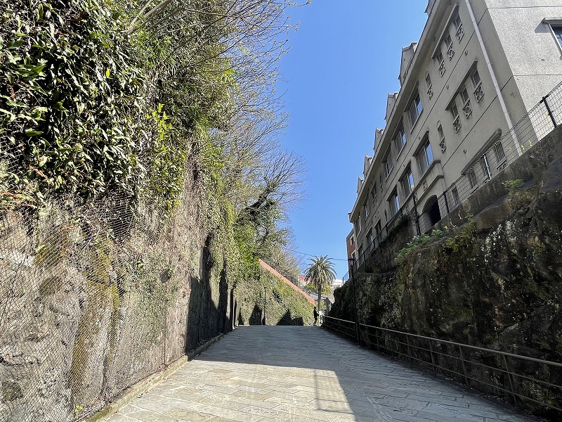 洋風住宅が建ち並ぶ石畳の「オランダ坂」。(2023.3)