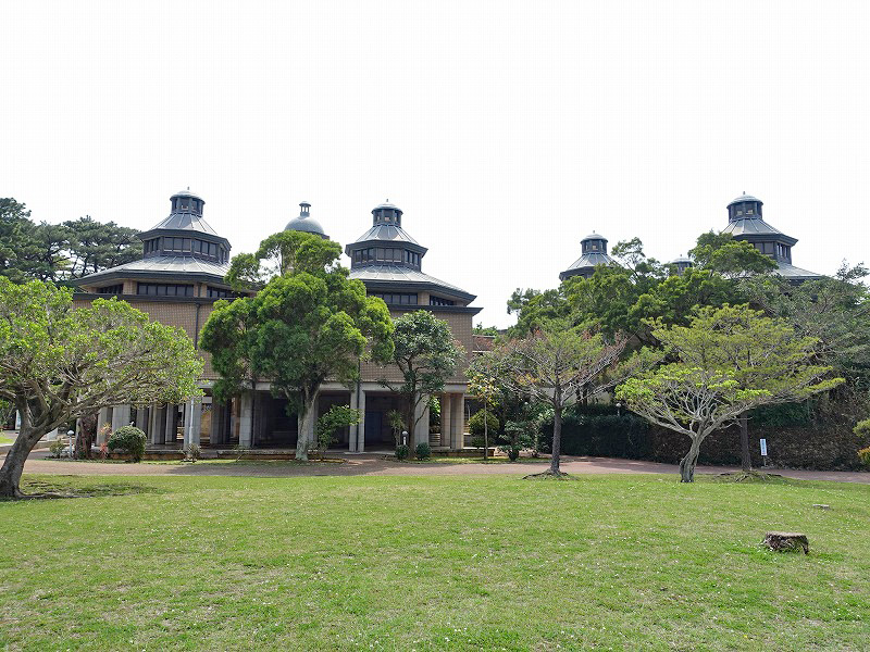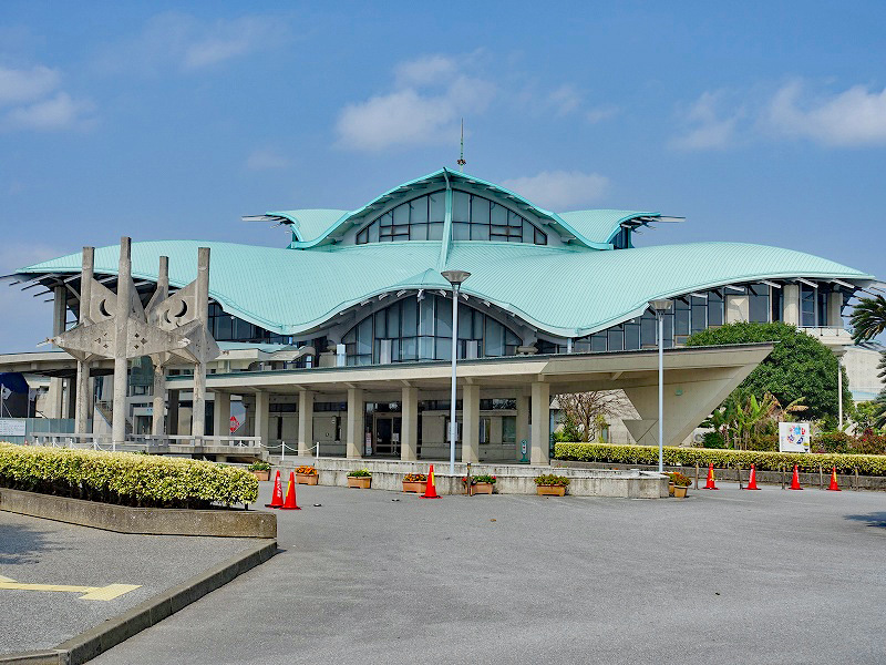トロピカルビーチに面した大谷幸夫設計による「沖縄コンベンションセンター」。(2020.3)