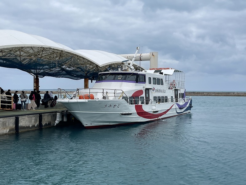 西表島「大原港」に入港する「安栄観光高速艇」。石垣港との間を約35分で結ぶ。(2023.2)